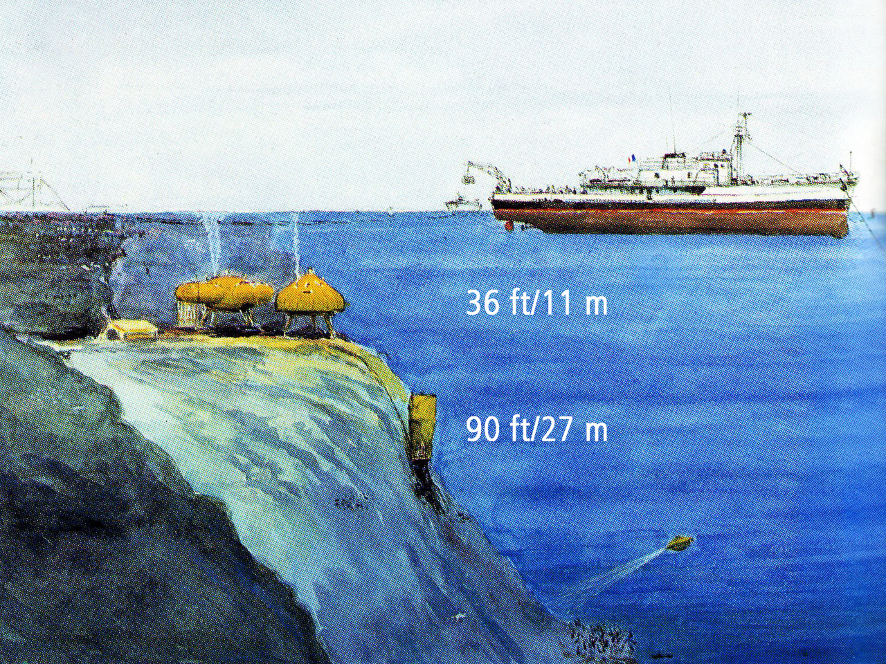 A second and considerably smaller habitat, the Deep Cabin, was placed at a depth of 90 ft/27 m. It was here where Jacques Cousteau tested the principles of saturation diving developed by Dr. George F. Bond (US Navy SEALAB) for the first time under real life conditions.