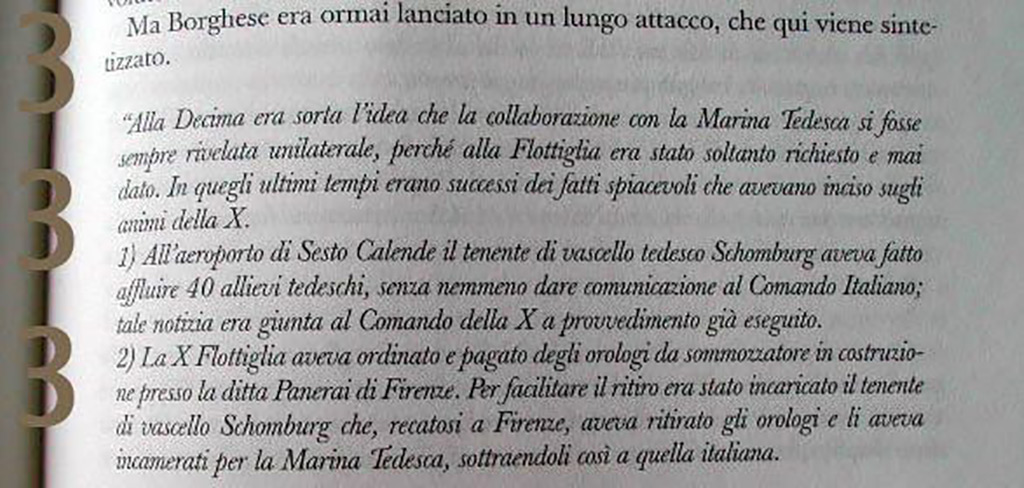 “2) La X Flottiglia aveva ordinato e pagato degli orologi da sommozzatore in construzione presso la ditta Panerai di Firenze. Per facilitare il ritiro era stato incaricato il tenente di vascello Schomburg che, recatosi a Firenze, aveva ritirato gli orologi e li aveva incamerati per la Marina Tedesca, sottraendoli cosi a quella italiana.”