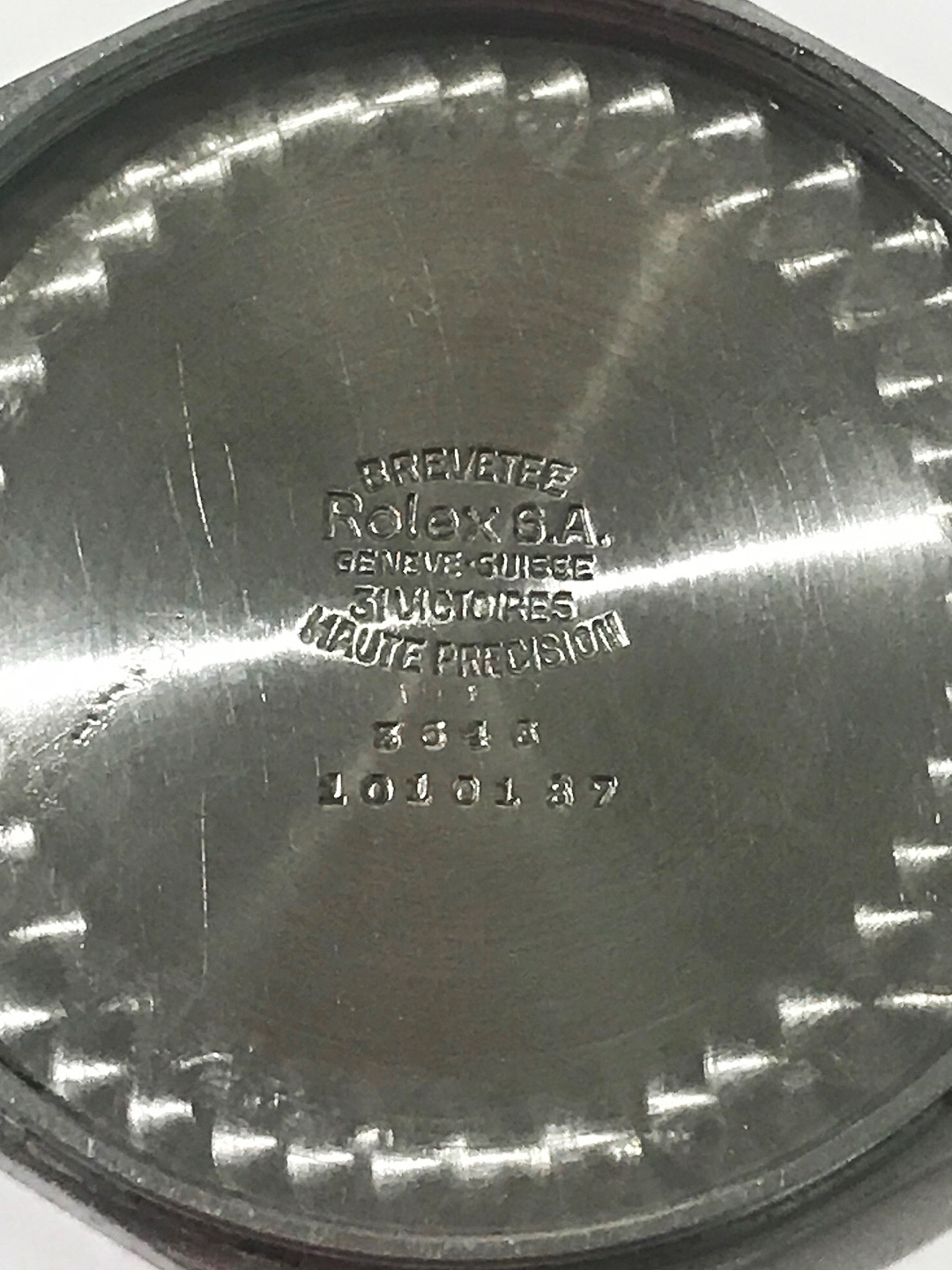 The next picture shows the inside of the caseback featuring typical Rolex stamps used by the famous Geneva company between 1938 and 1945. The 7-digit Rolex case number 1010187 is from 1942/43.
