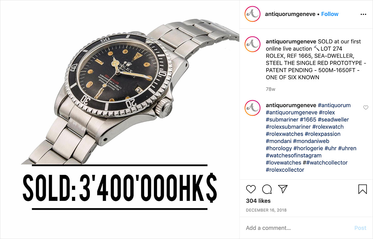 A few days later, Antiquorum made the following Instagram post to celebrate the sale of Lot 274. At the time, HKD 3,400,00 were the equivalent of around USD 435,000. Quite a sum for a fake prototype.