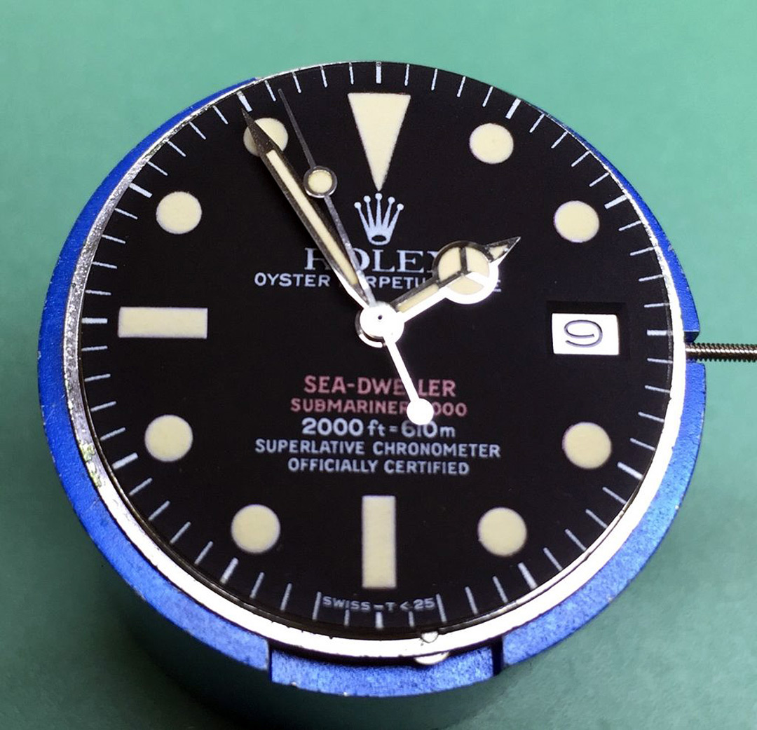The movement main plate underneath the dial showed slight surface corrosion which is quite common and completely unrelated to water damage. This is regular contact corrosion that occured between the plated brass of the movement main plate and the stainless steel of the case. Tool marks can been seen as well. This type of corrosion can be found on Rolex Sea-Dwellers with perfectly well-preserved dials.