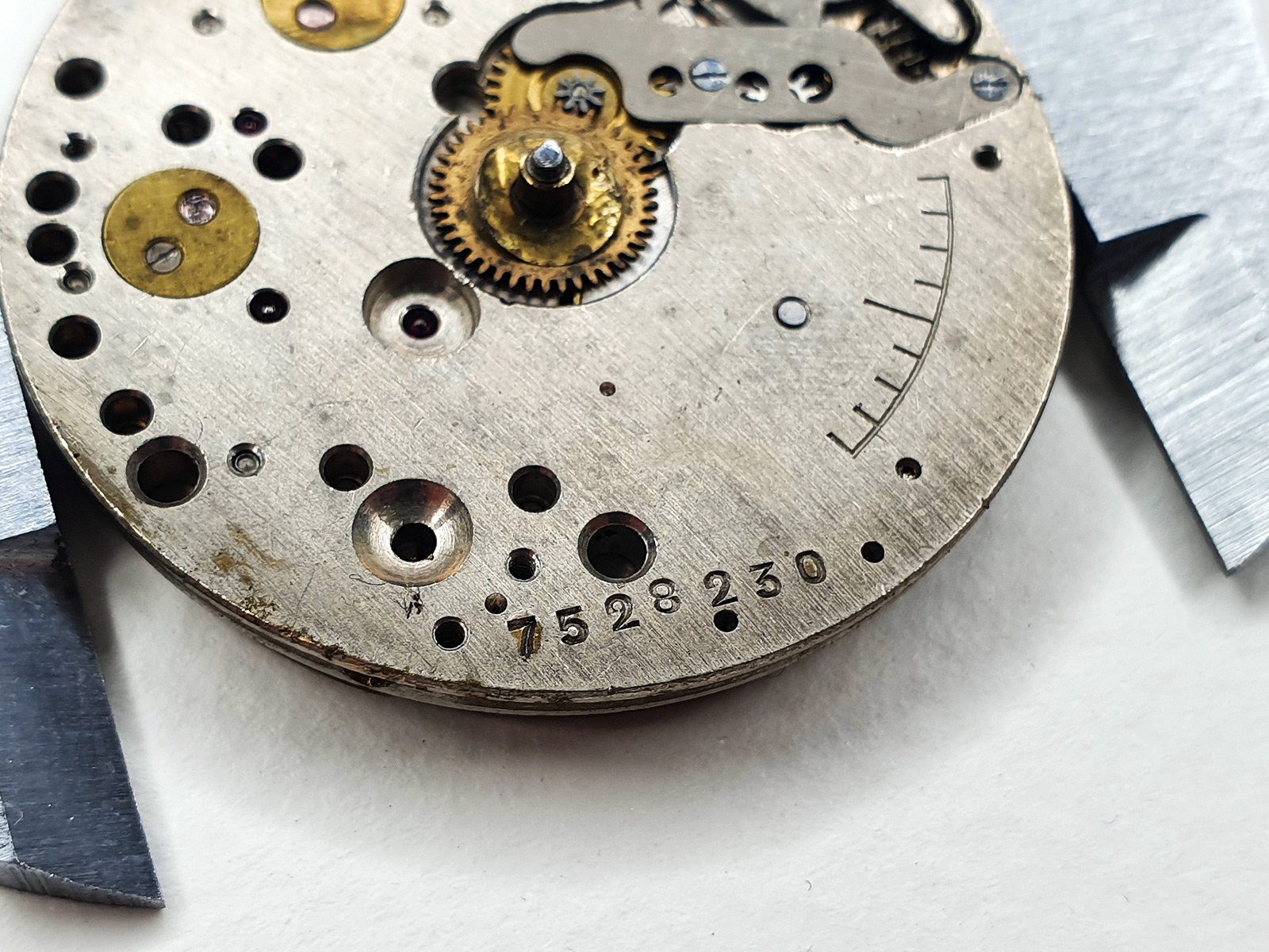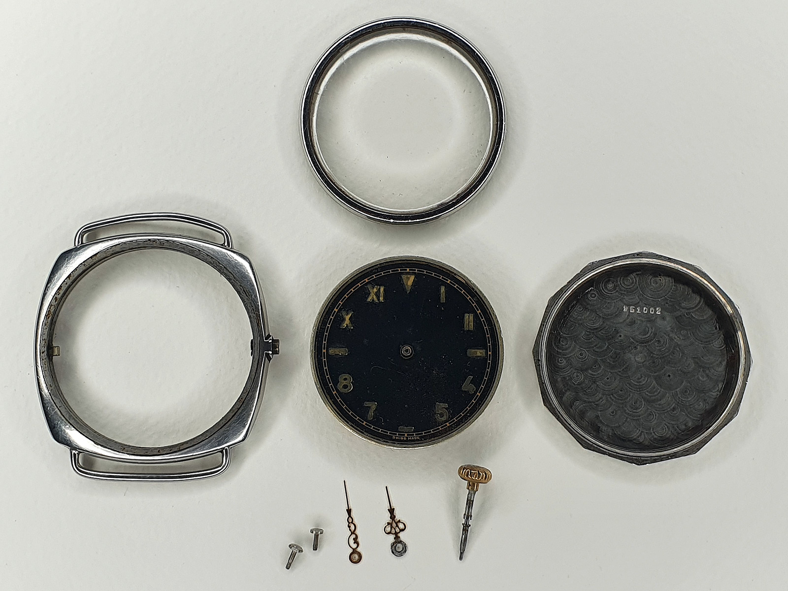 A plausible explanation for the dial condition could be the lack of a screw-down crown. The current crown is probably from a pocket watch. To accomodate it, the threads of the original crown tube were filed down. This construction left the inside of the watch open to moisture ingress. The hands are obviously not original. These are so-called ‘Louis XV’ pocket watch hands which collide visually with the ‘Art Deco’ style of the dial. Given the condition of the dial, it can be assumed the original heat blued steel hands became rusty and were replaced for cosmetical reasons.