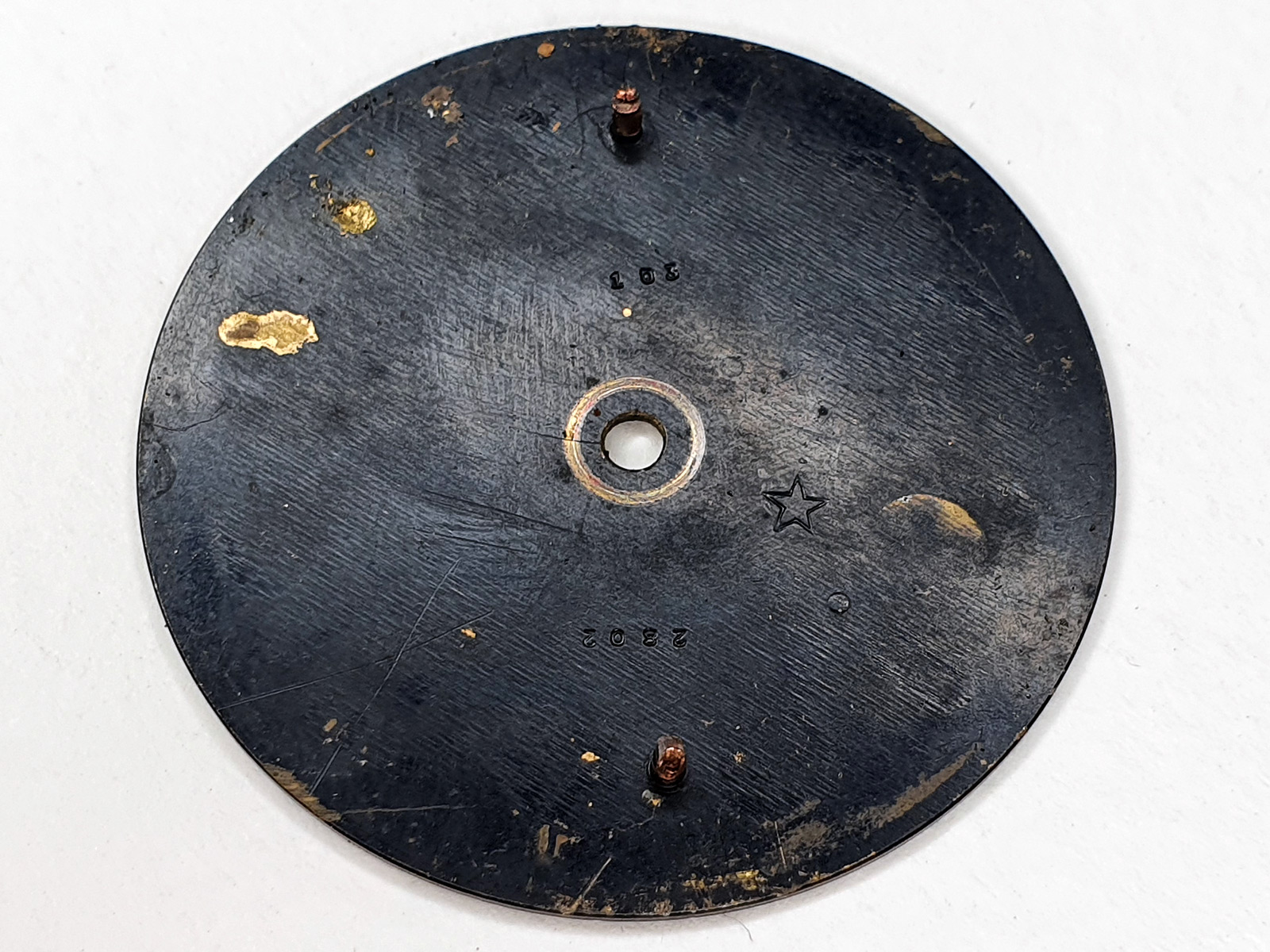 Another important detail are the dial maker markings on the back of the ‘Error-Proof’ dial. These dials were made by dial maker Stern Frères in Geneva. The back of the dial is marked with a star which was Stern’s logo. Stern is a German name and means star. The number 103 was Stern’s client number for Rolex and 2802 was the reference number of the dial itself.