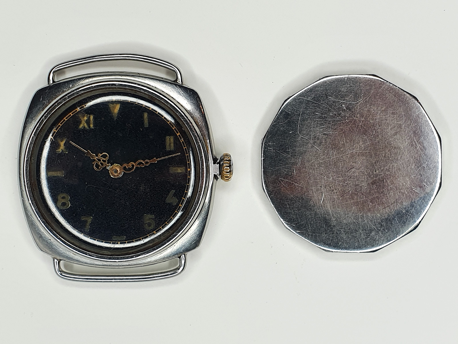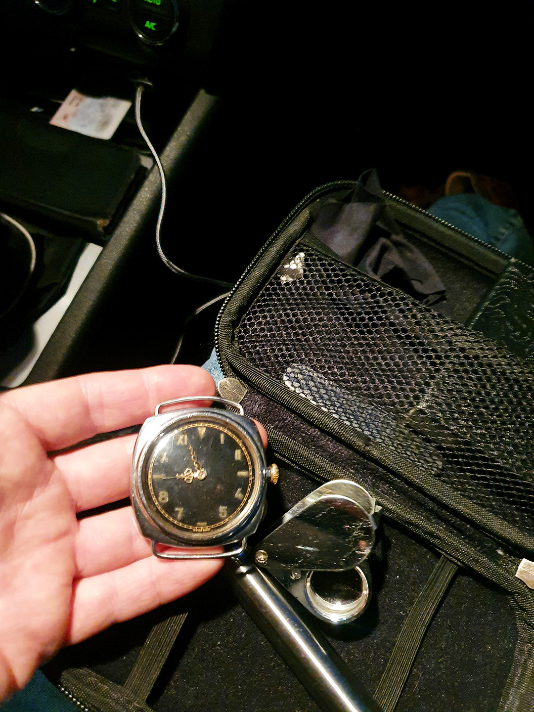The watch was the size of a pocket watch. The cushion case featured soldered wire lugs so that it could be worn on the wrist. A pocket watch for the wrist? Maybe one of the famous trench watches from WW1? Our young fellow had no idea what he had come across but instinctively negotiated a good price and took it home for a fistful of Euro coins. How much is a fistful you ask? 15, one five, but pssst, do not tell anyone or the bazaar will soon be overrun by drooling watch dealers in hippie clothes!