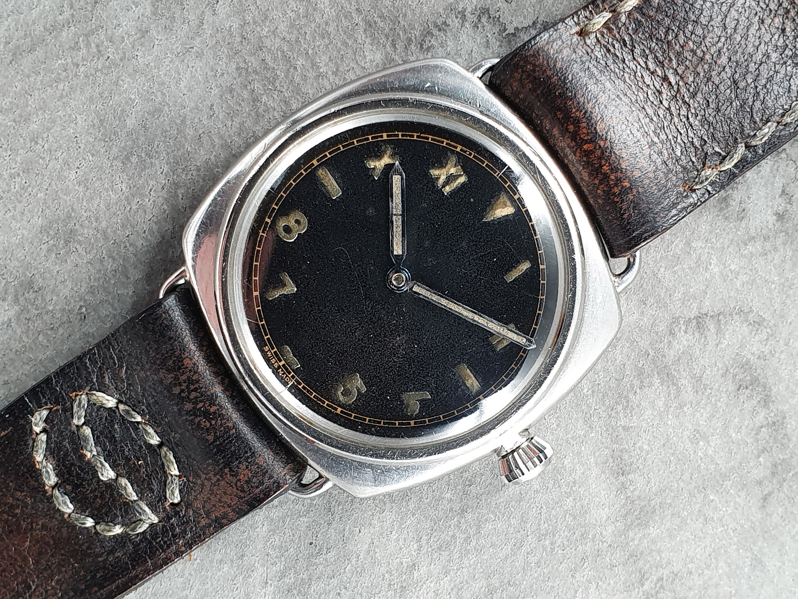 Jay’s photos give us a great insight into the details and condition of the watch. The ‘Error-Proof’ dial which people today often refer to as ‘California’ dial appears to have been exposed to moisture over a long period of time. This led to a distinct darkening of most radium numerals.