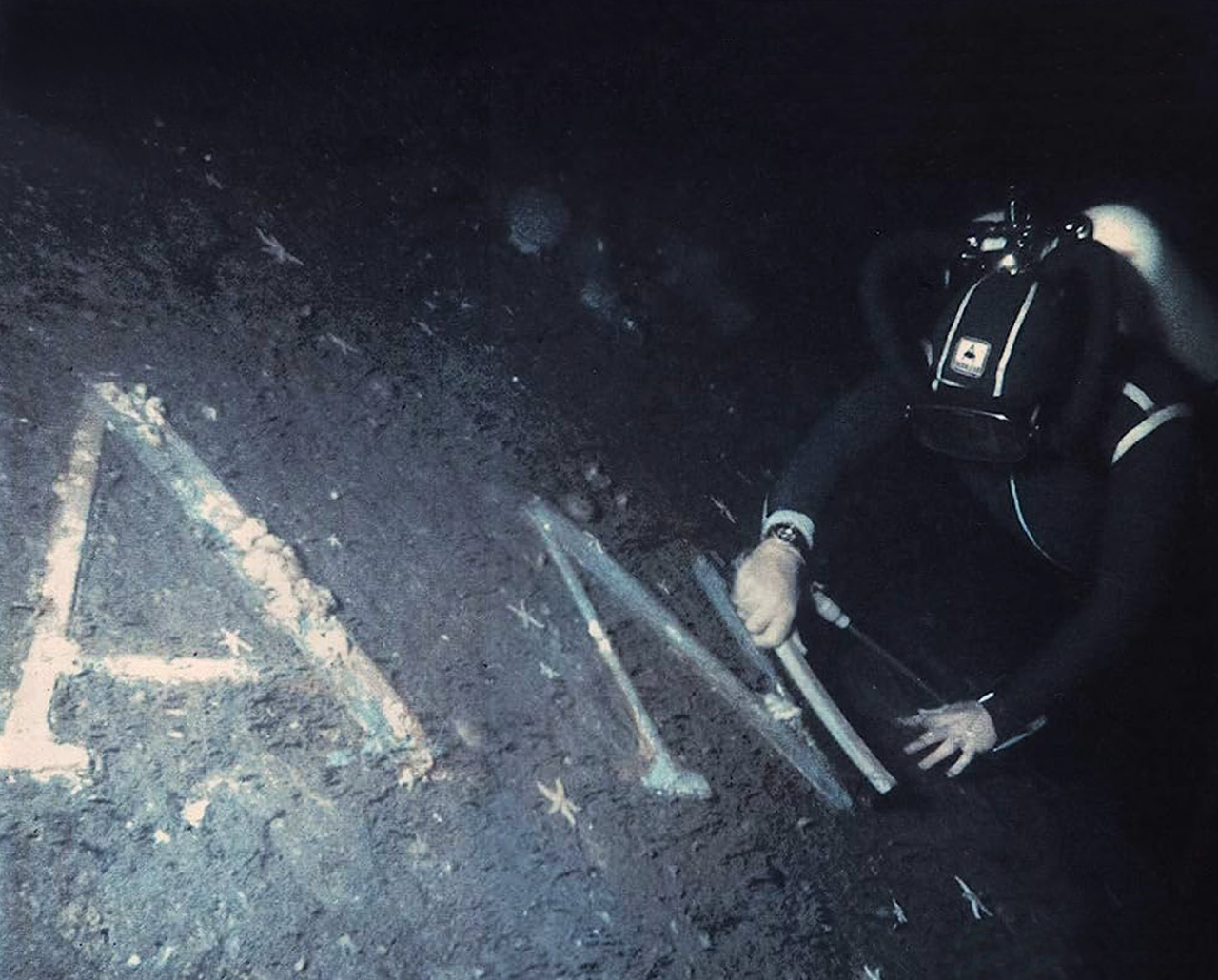 The next picture shows Stefano Carletti brushing silt off the bronze letters of the ship’s name at stern. He too wore a Rolex Submariner.