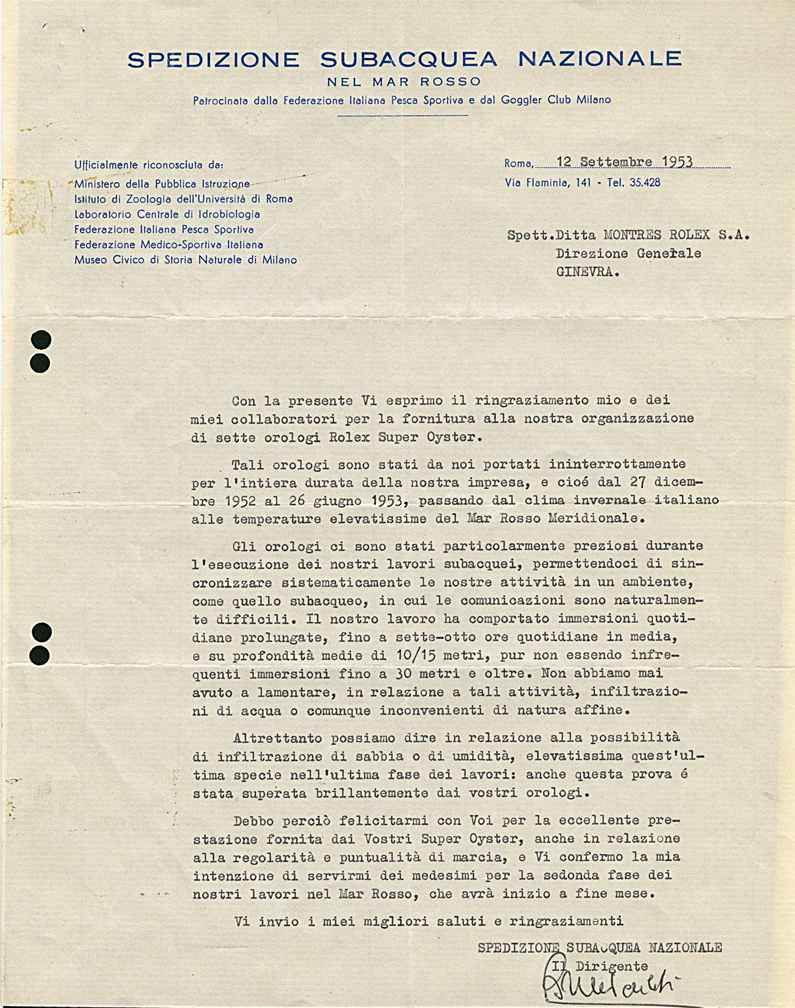 Prior to publishing this article, I reached out to Rolex to ask if they had any information related to the expedition. It took them a few days to dig through the records but boy did the good folks at Rolex deliver. What they found is a document that confirms the whole story in addition to providing important facts like the total number of watches supplied. It is a letter written on September 12, 1953 by the Director of the ‘National Underwater Expedition to the Red Sea’, Bruno Vailati.