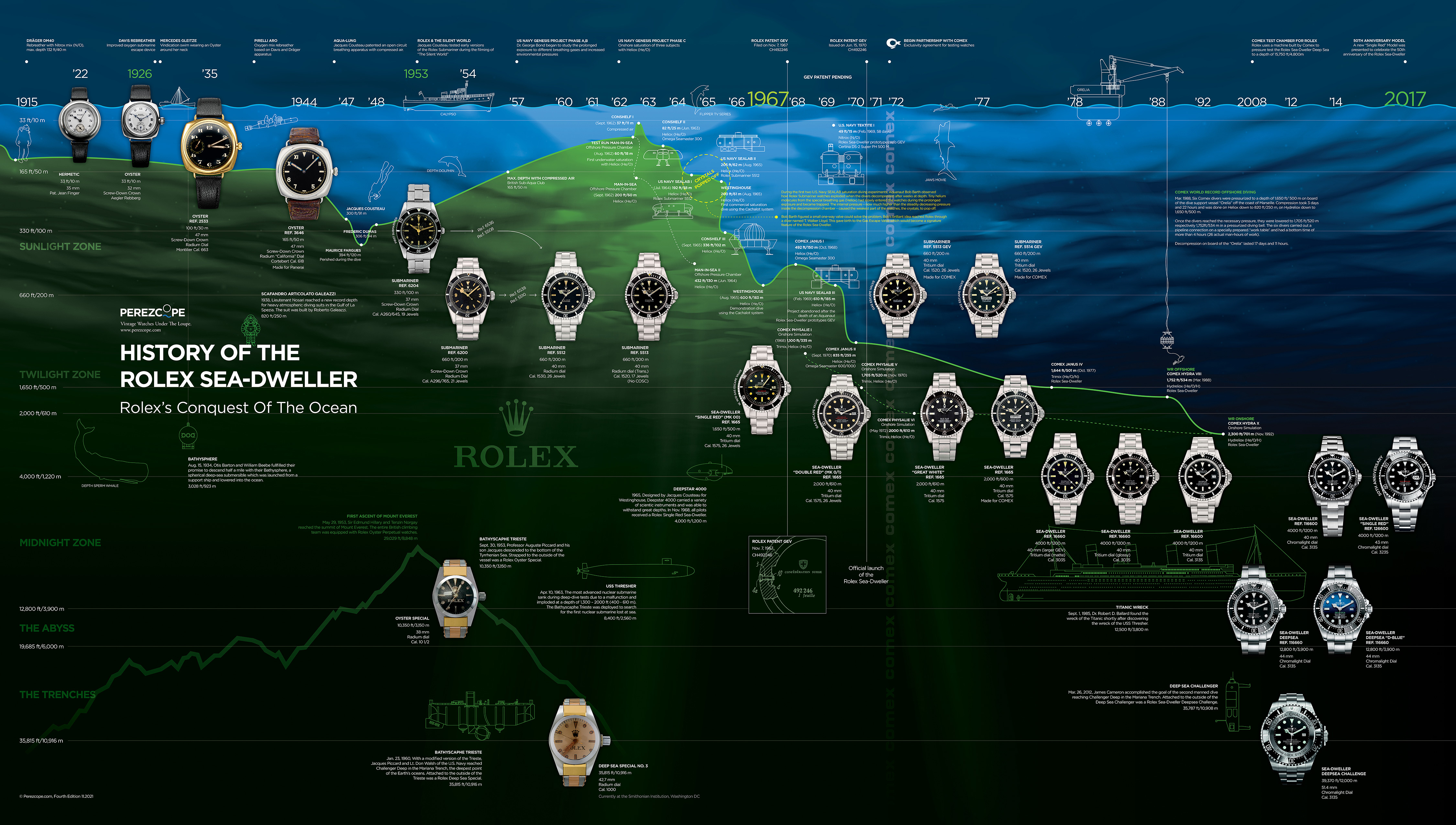 The Rolex Sea-Dweller was developed in the late 1960s for the specific purpose of saturation diving. The entire history of saturation diving is visualized in the following infographic. Click the picture to zoom in.