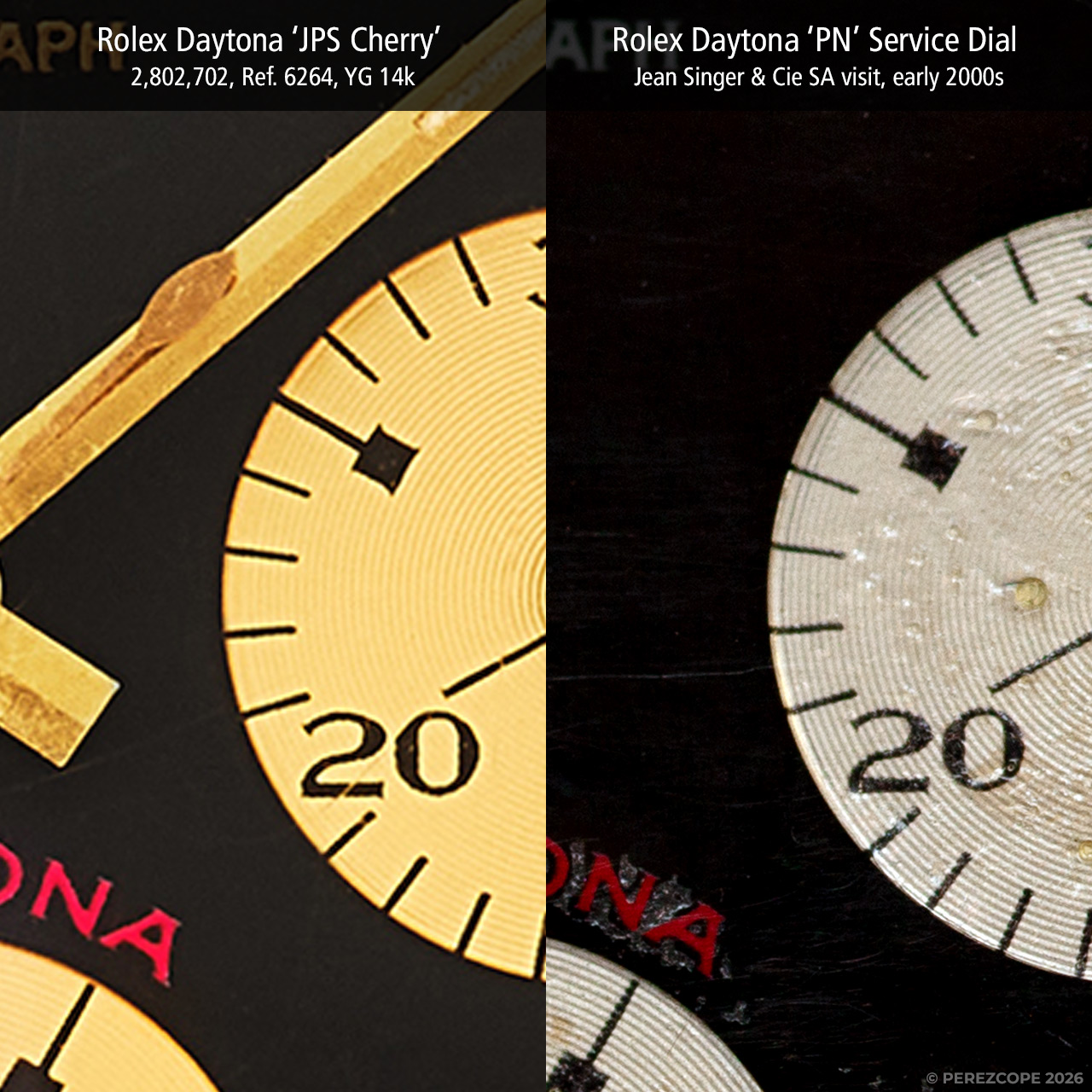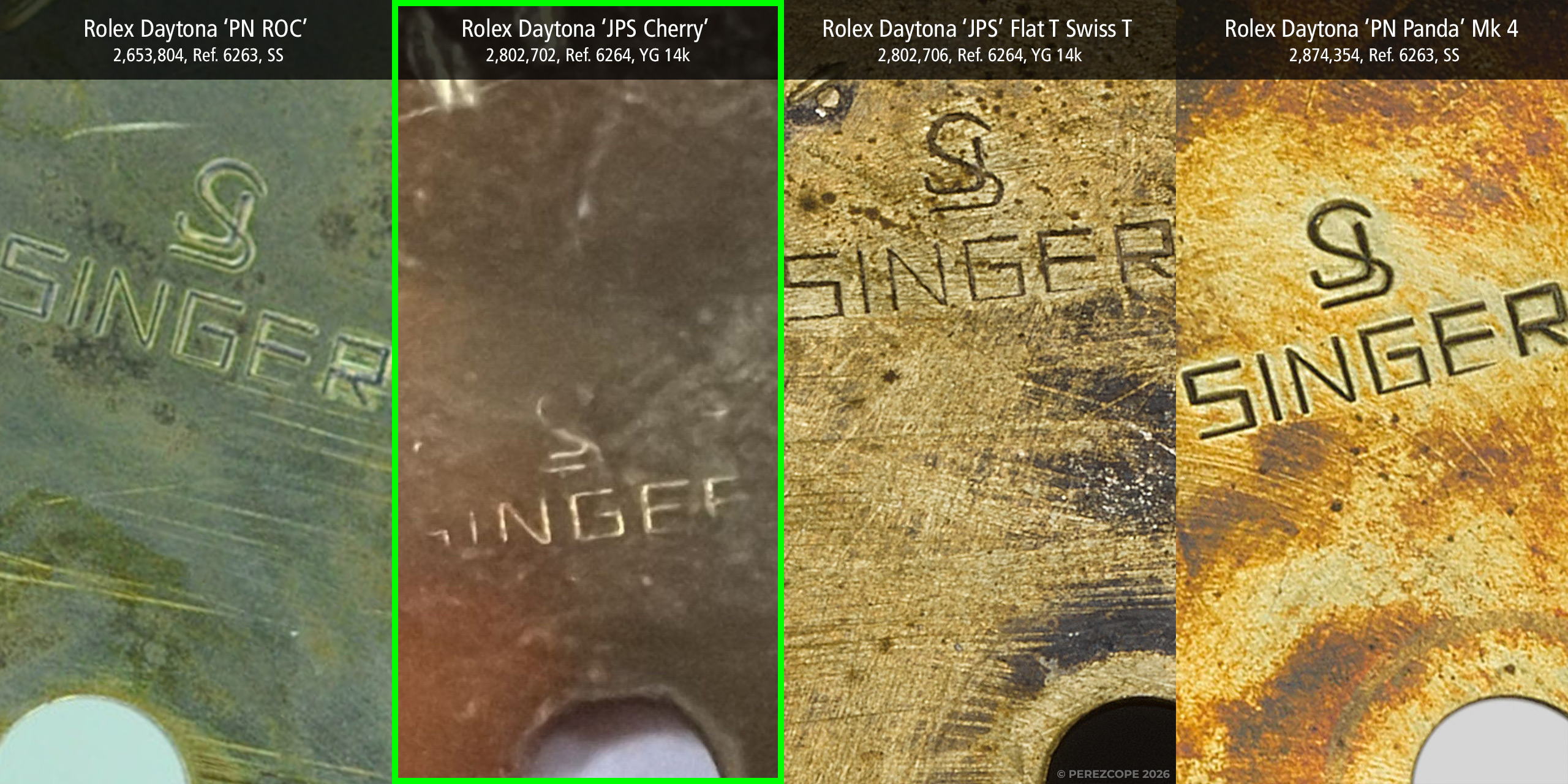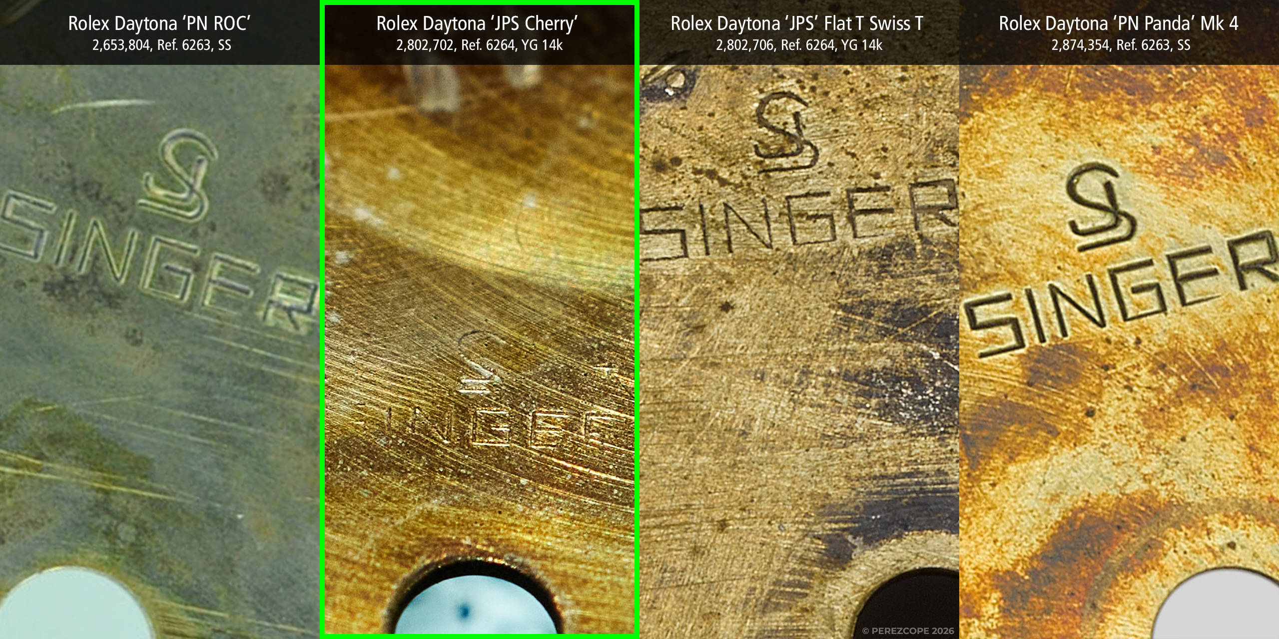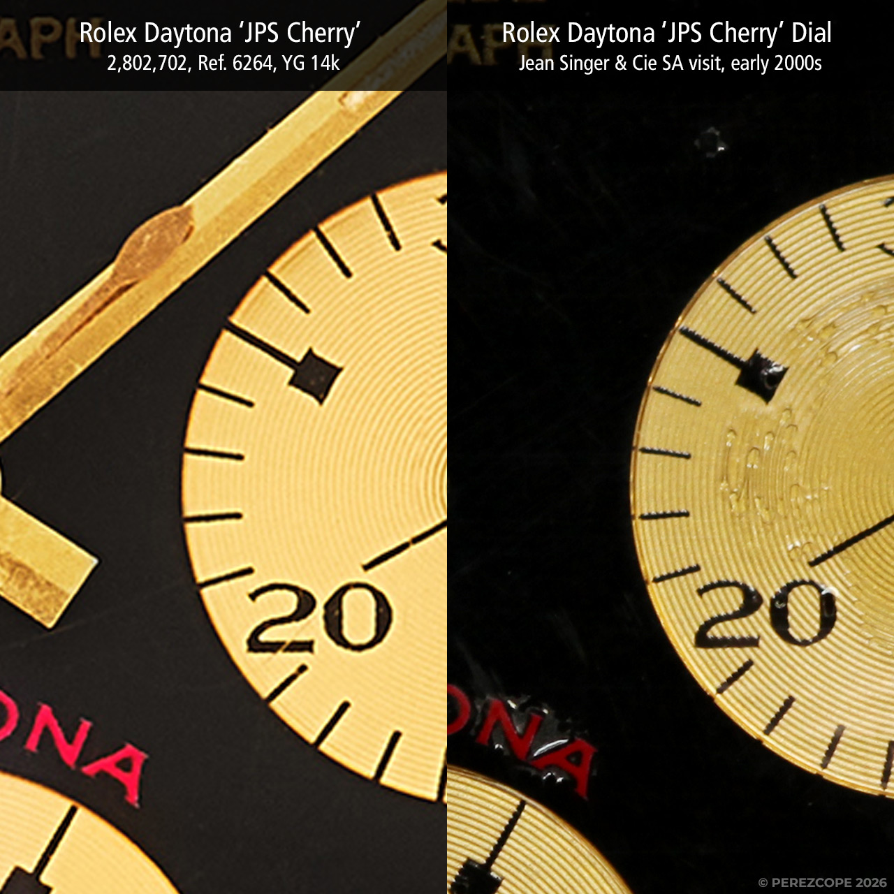 These important details show that the present ‘JPS Cherry’ dial is unlikely to have been produced in the 1970s or 1980s, as Singer did not work like that at the time. In addition, and this is important, we know that the Singer stamp with the two plus signs was used well into the 1990s, as evidenced by its depiction in Pucci’s book.