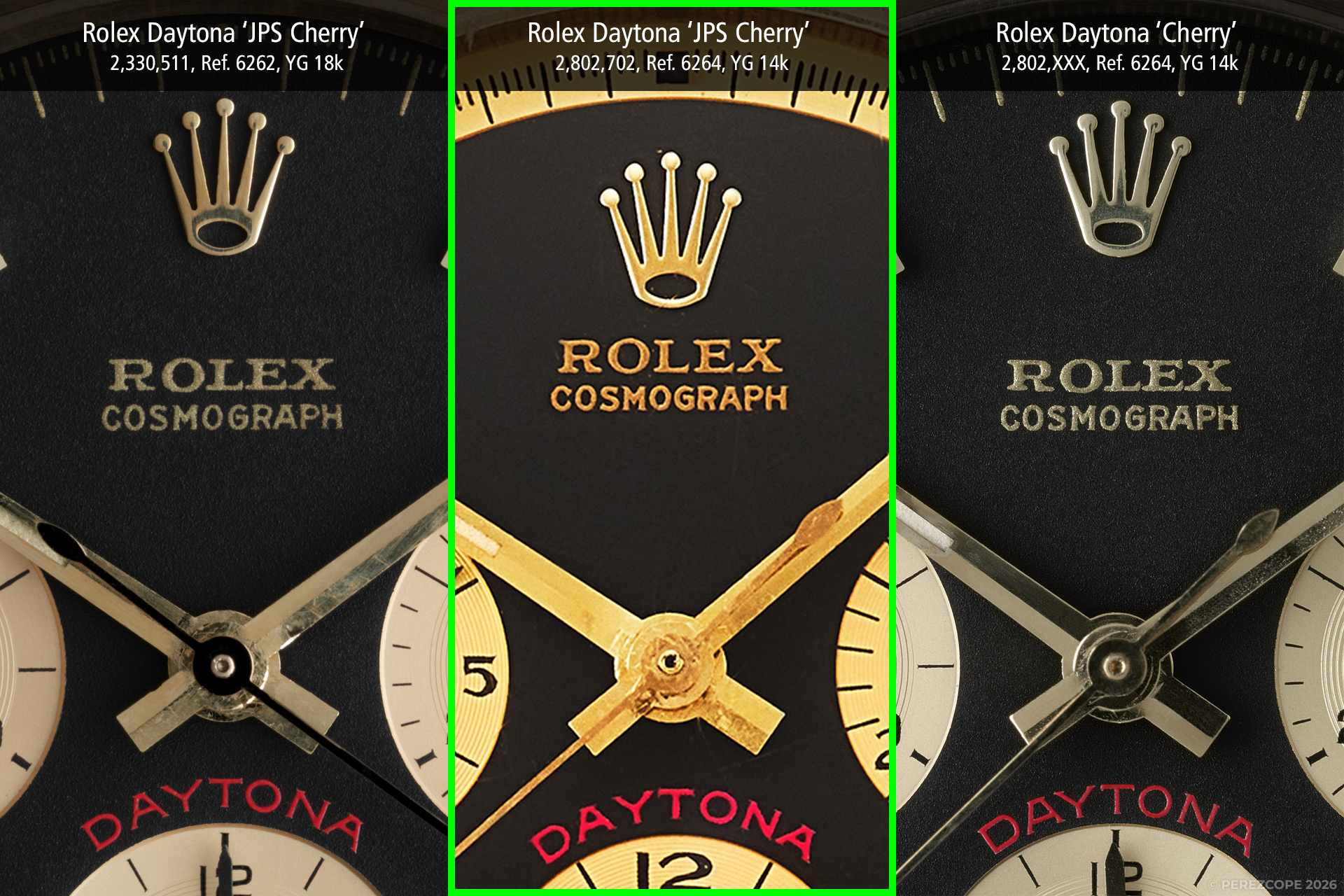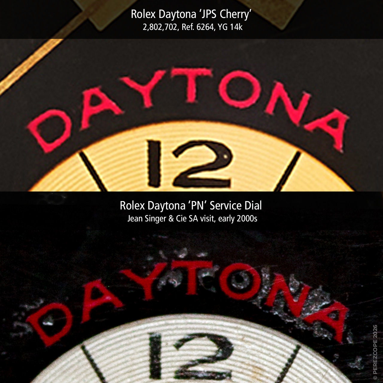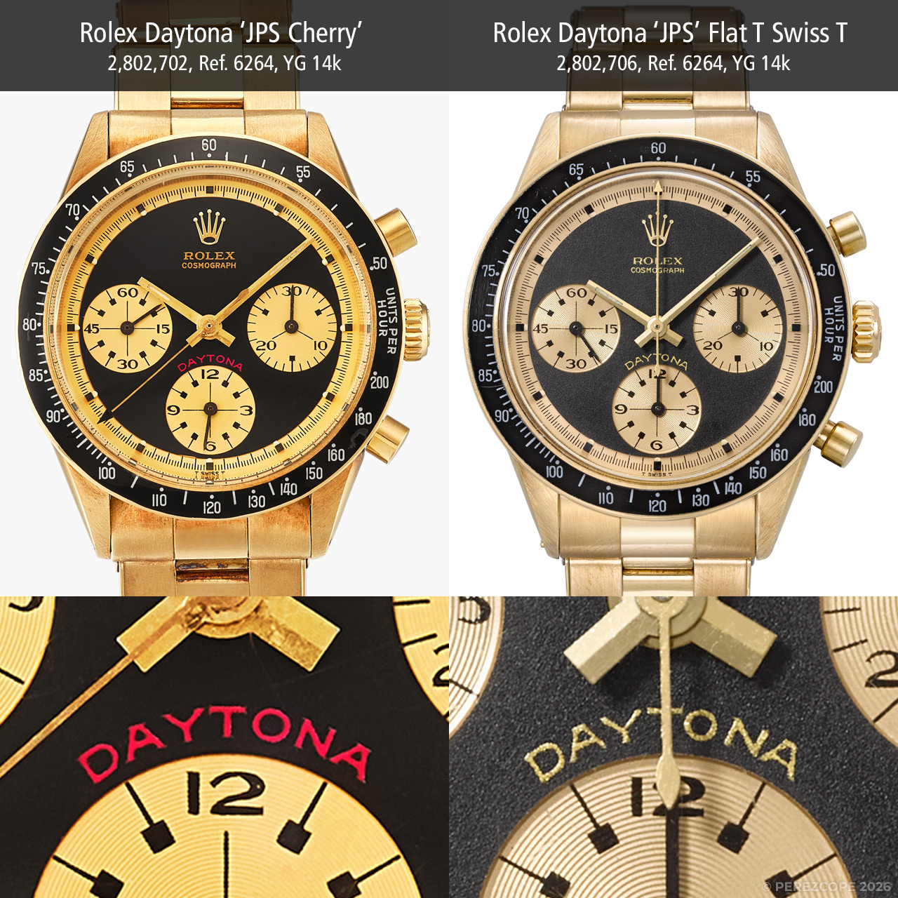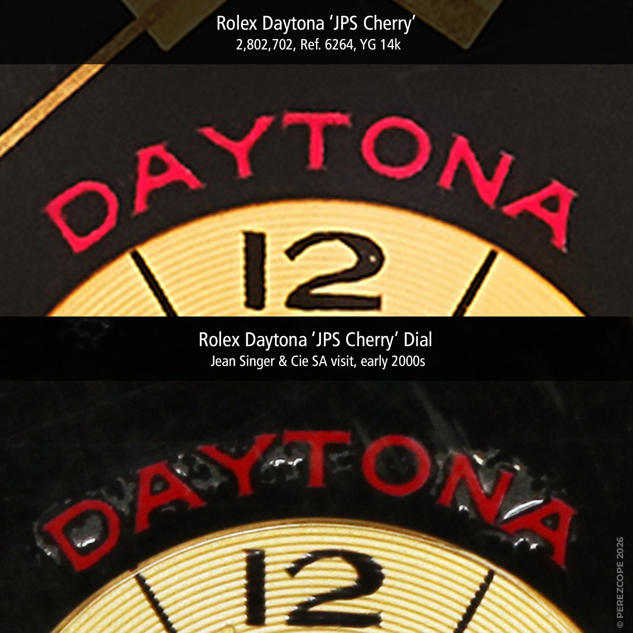 In 2016/2017, American dealer Bob Maron found a curious variant of the ‘JPS’ dial. Instead of the usual gold-printed ‘Daytona’ above the subdial at 6 o’clock, the newly discovered variant featured a red-printed ‘Daytona’, as shown in the comparison below.