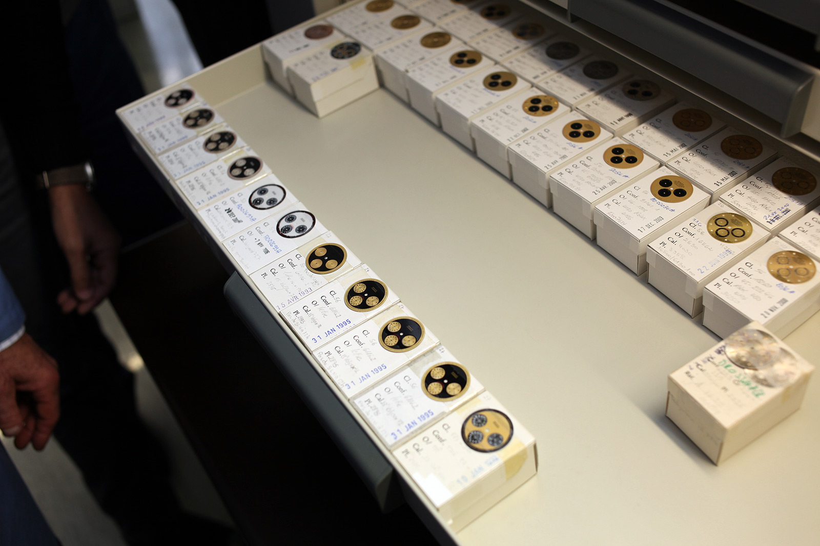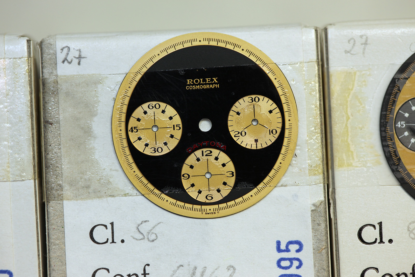 Coming back to its discovery around ten years ago, the ‘JPS Cherry’ dial was actually known since at least the early 2000s, when a group of Italian watch enthusiasts was invited to visit the famous dial factory Jean Singer & Cie SA in La Chaux-de-Fonds, Switzerland. Stefano Mazzariol, prominent watch dealer and owner of the super useful Mazzariol Library, documented the trip. During the tour, the Italians were shown drawers full of service dials, many of which were ‘Paul Newman’ dials. Packed in boxes à 27 pieces each.