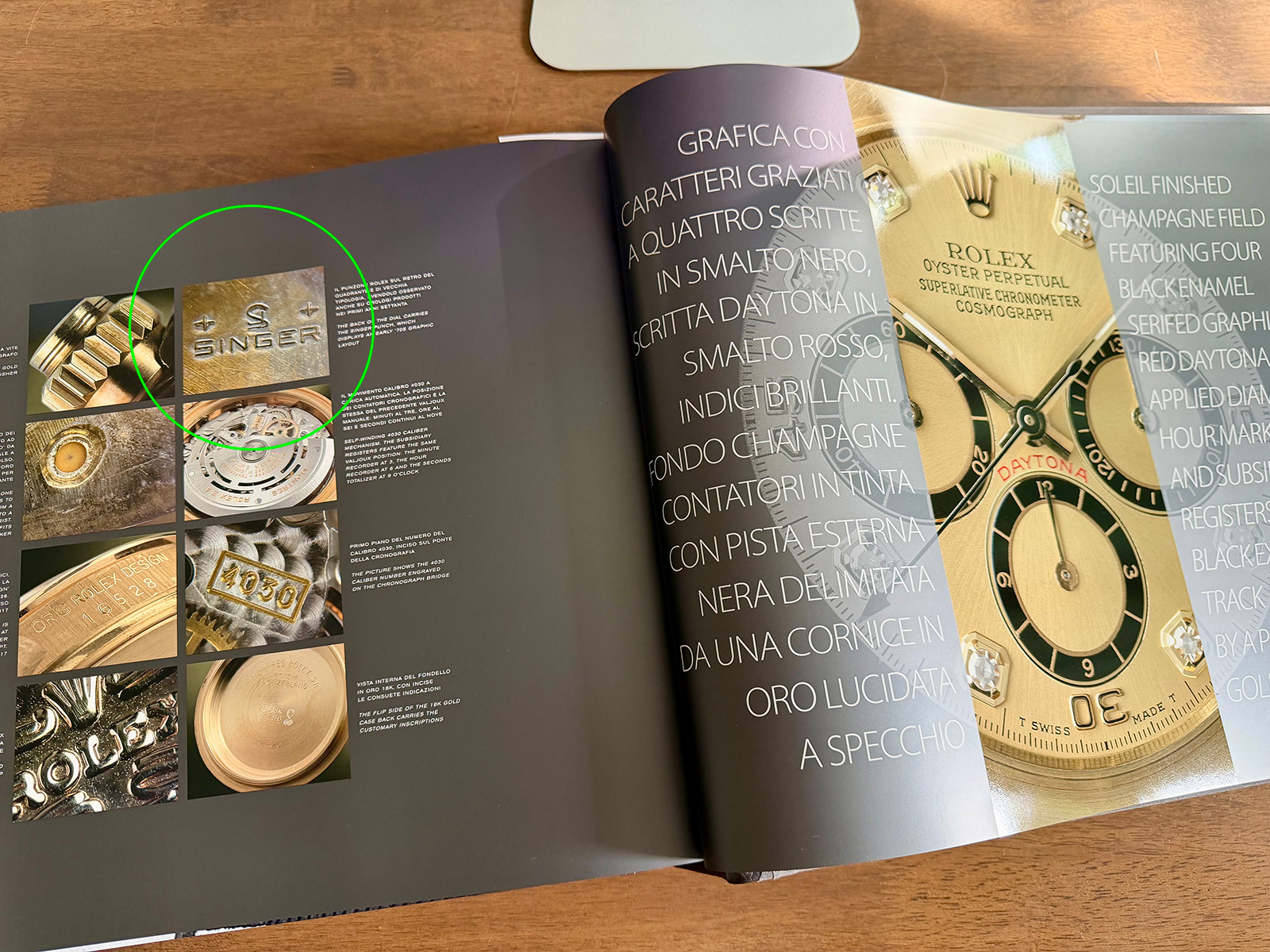 The last series of ‘Superlative Chronometer Officially Certified’ gold dials for Ref. 6263/6265 from the late 1980s feature the same details. The only difference is that the Singer markings changed.
