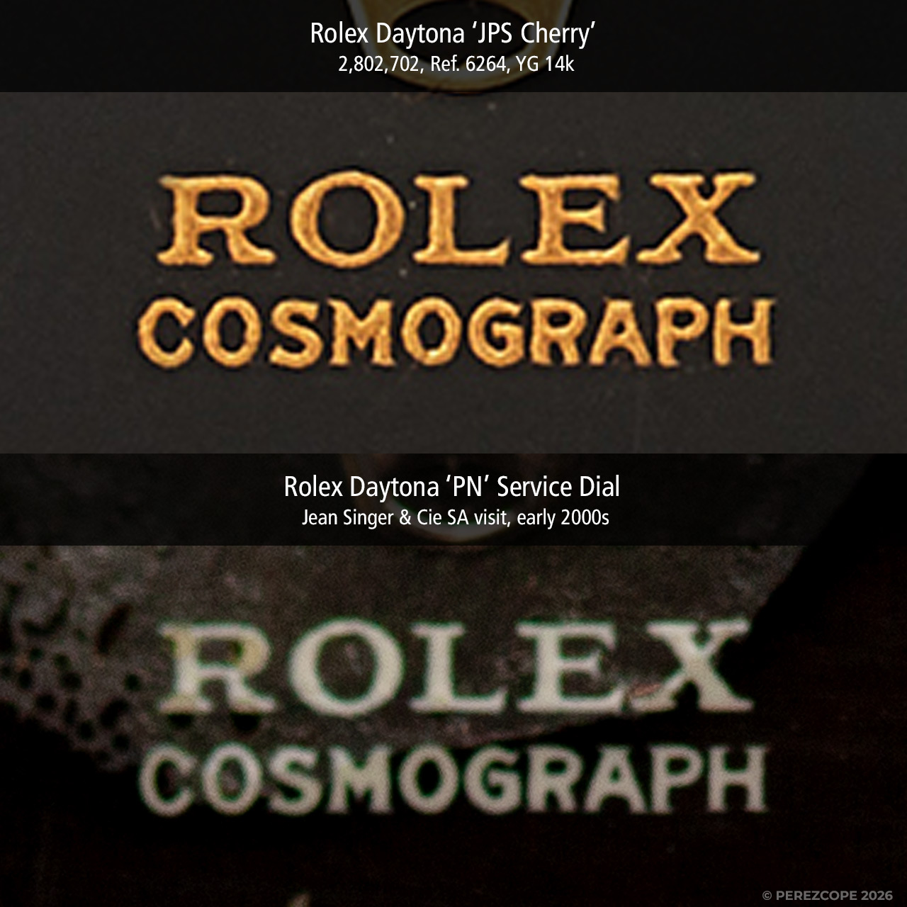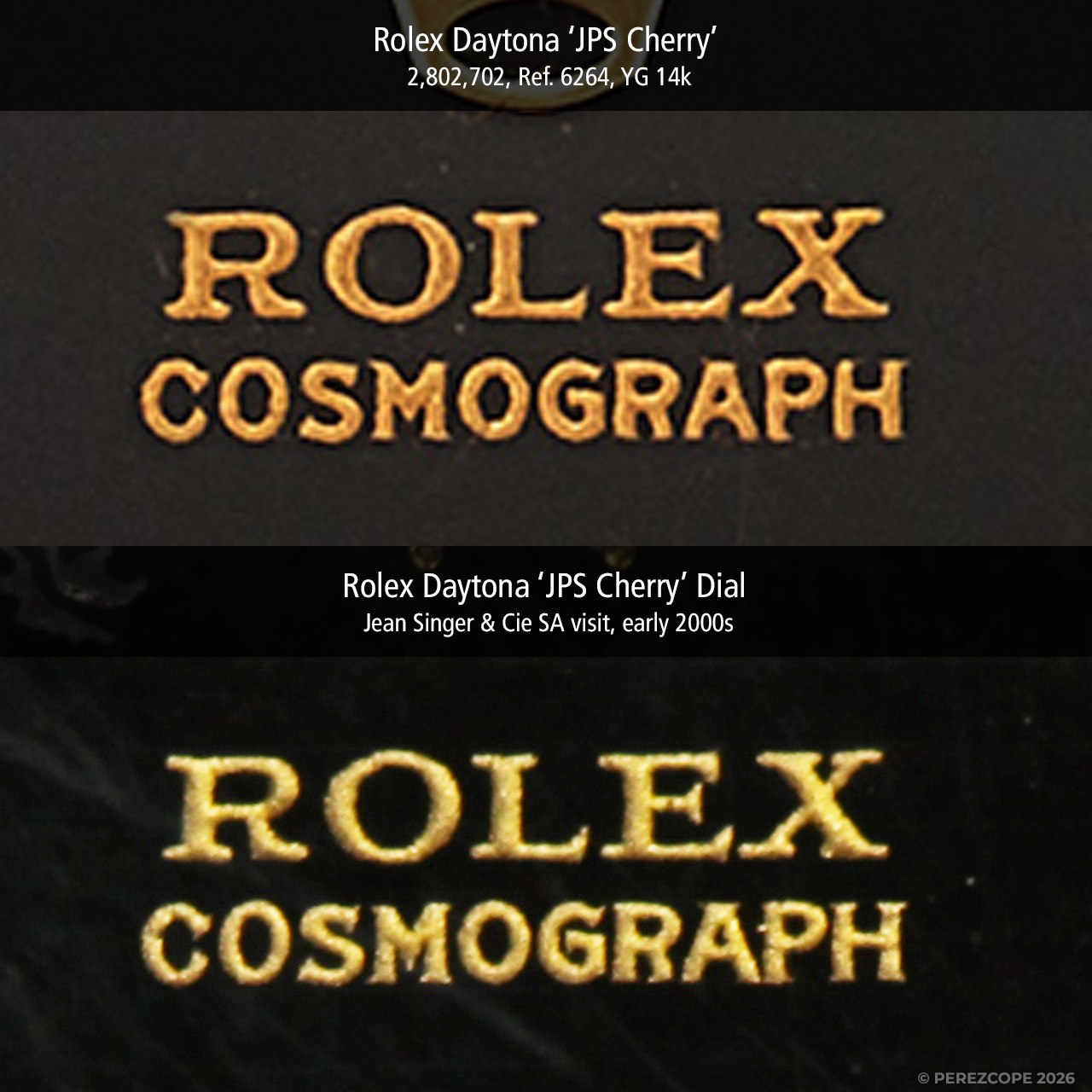 In the past, some people have claimed the ‘JPS Cherry’ cannot possibly be a service dial because the ‘Rolex Cosmograph’ and ‘Daytona’ print is the same as on standard ‘Cherry’ non-Paul Newman dials found in Ref. 6262/6264. This is absolutely not true and is easily disproven by the comparison below. One look at the E of Rolex suffices to see that the logo is not the same. The bottom arm of the E is considerably longer than the arm at the top. Further, note the weird spacing between the A and Y of Daytona, and the differently shaped As.