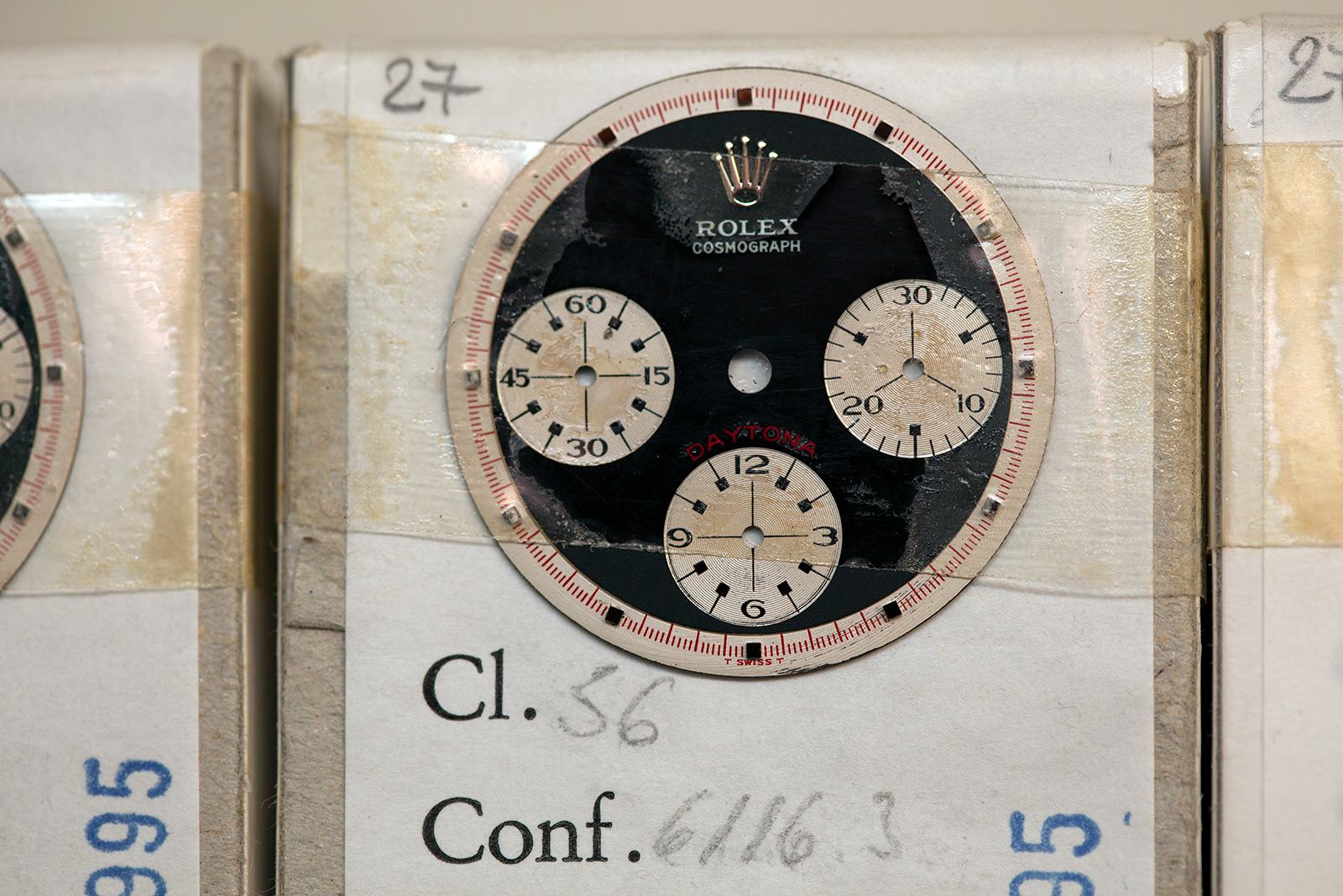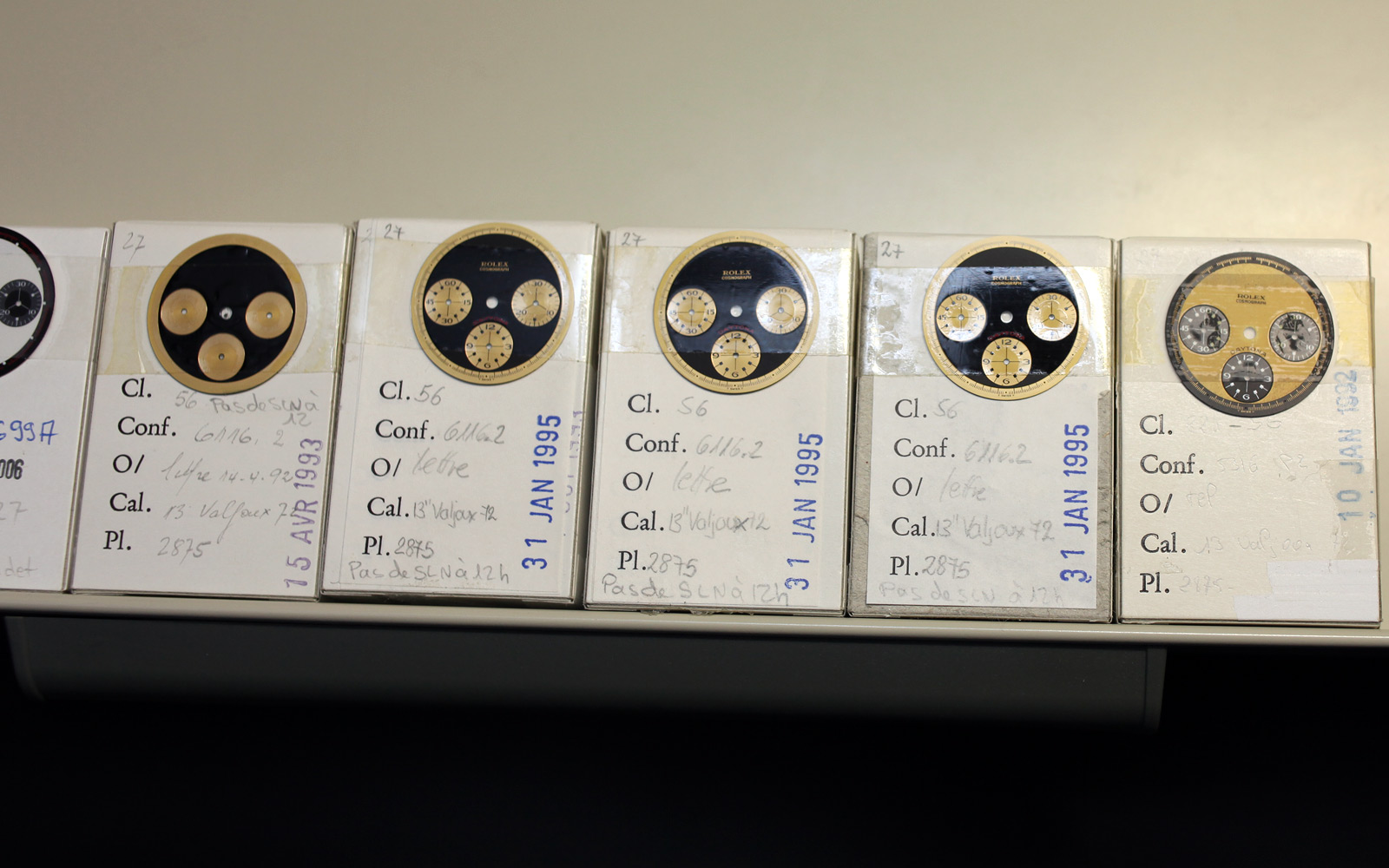 Let us go closer. Note the production dates on the boxes. Note also what is handwritten at the bottom of some of the labels. “Pas de SLN à 12h.” French for ‘no Super LumiNova at 12 o’clock.’ Interesting! ‘Paul Newman’ dials do not feature a luminous dot at 12 o’clock.