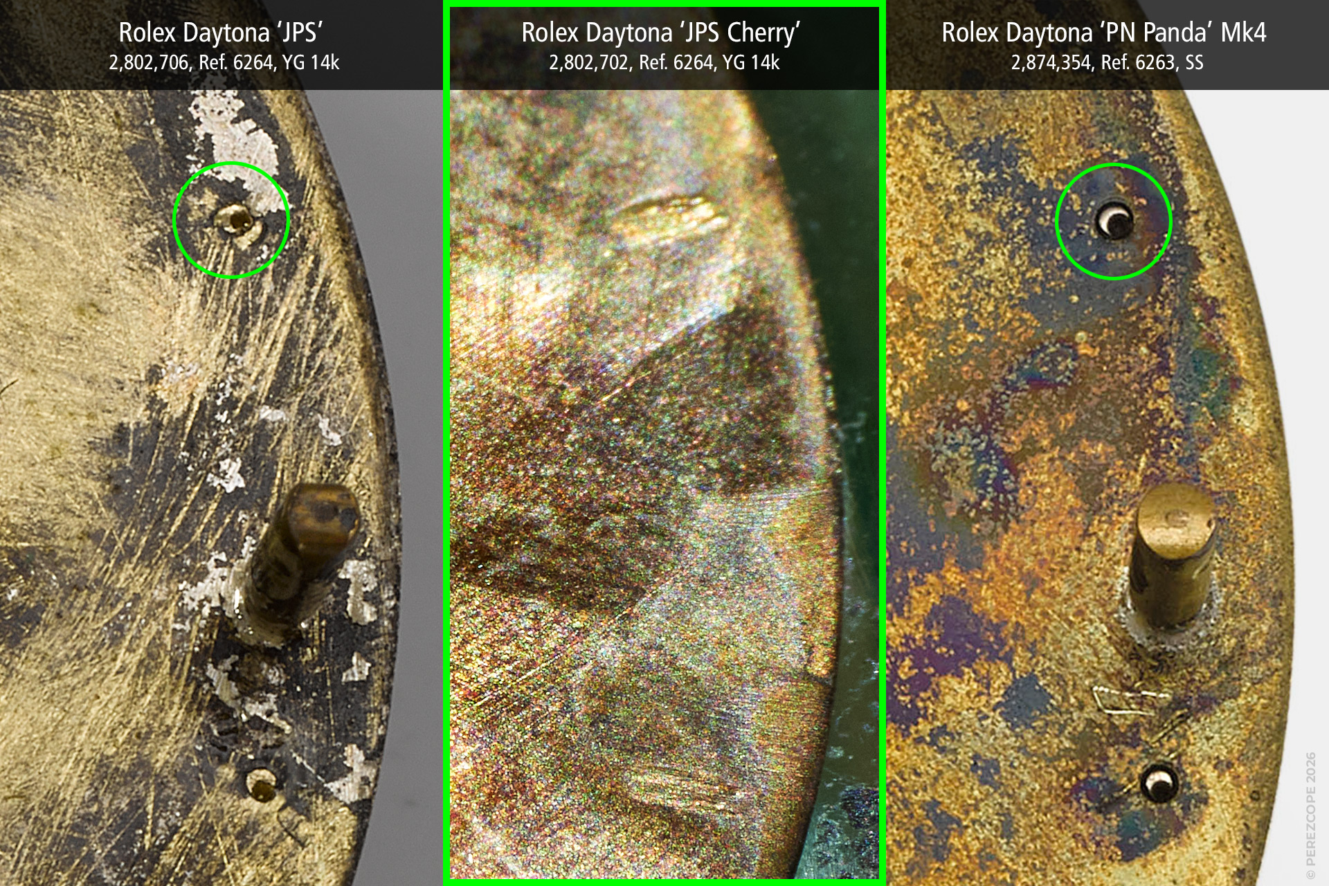 Another detail often cited regarding ‘JPS Cherry’ dials is that the Daytona print is misaligned. The distance to the subdial at 6 o’clock is smaller at the D than at the A at the end. On standard ‘Cherry’ dials, it is nearly perfect.