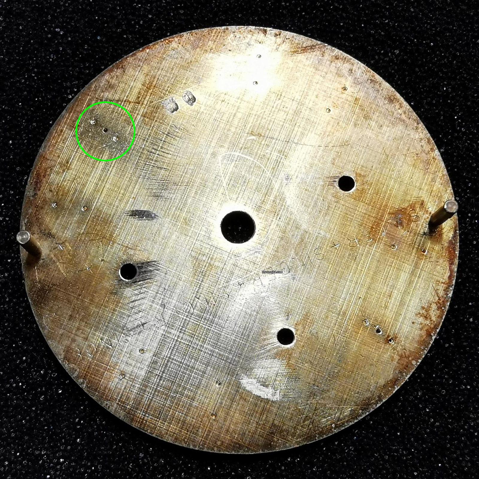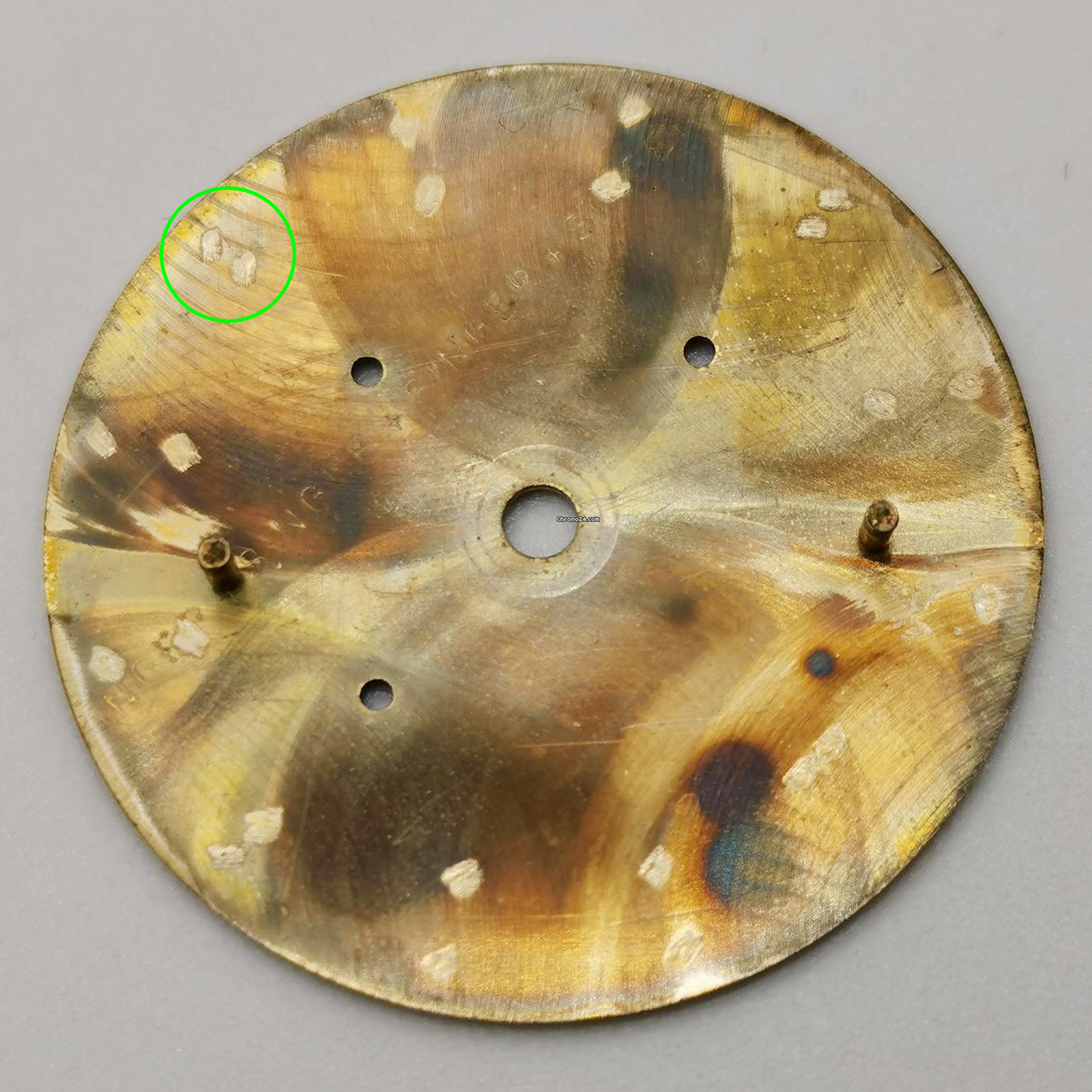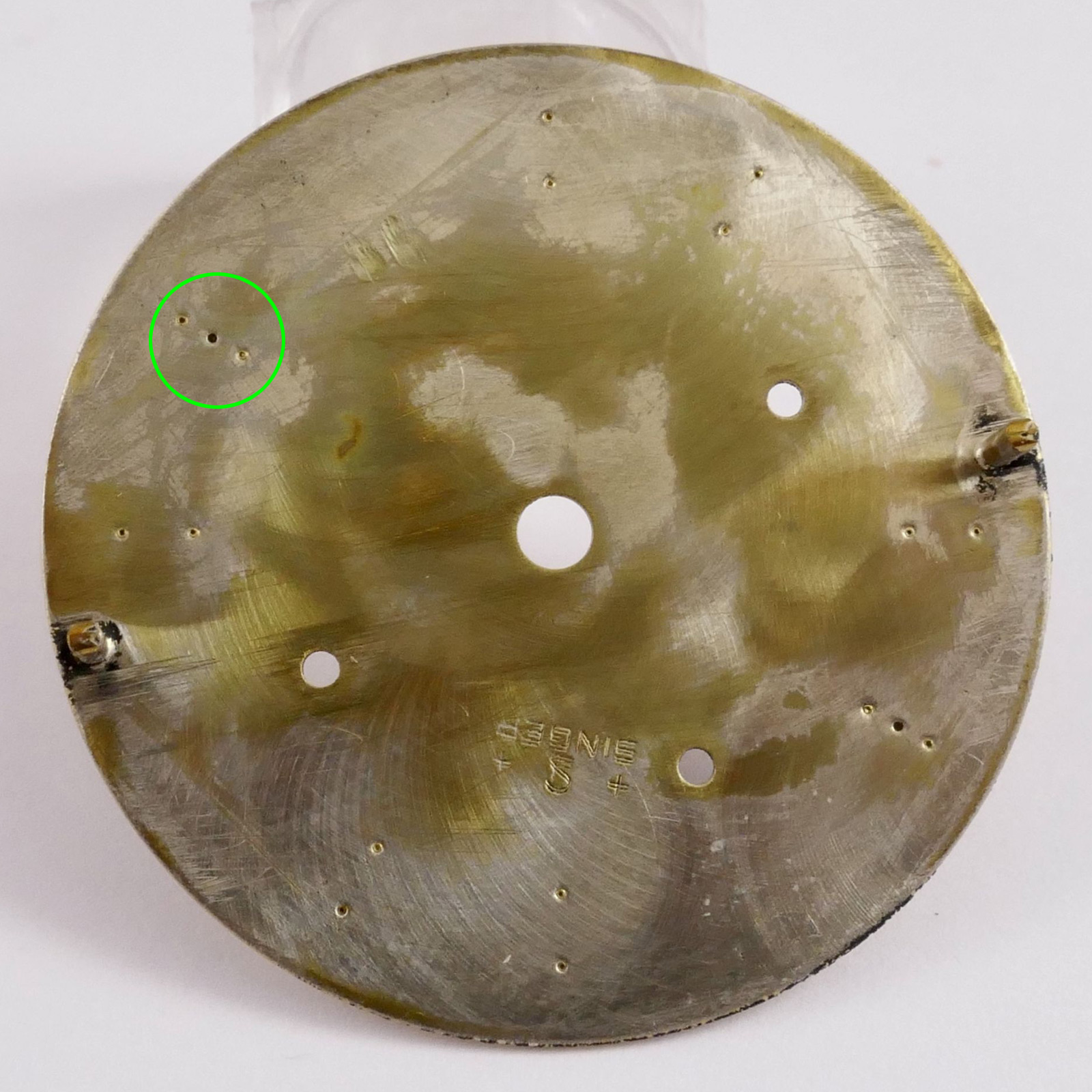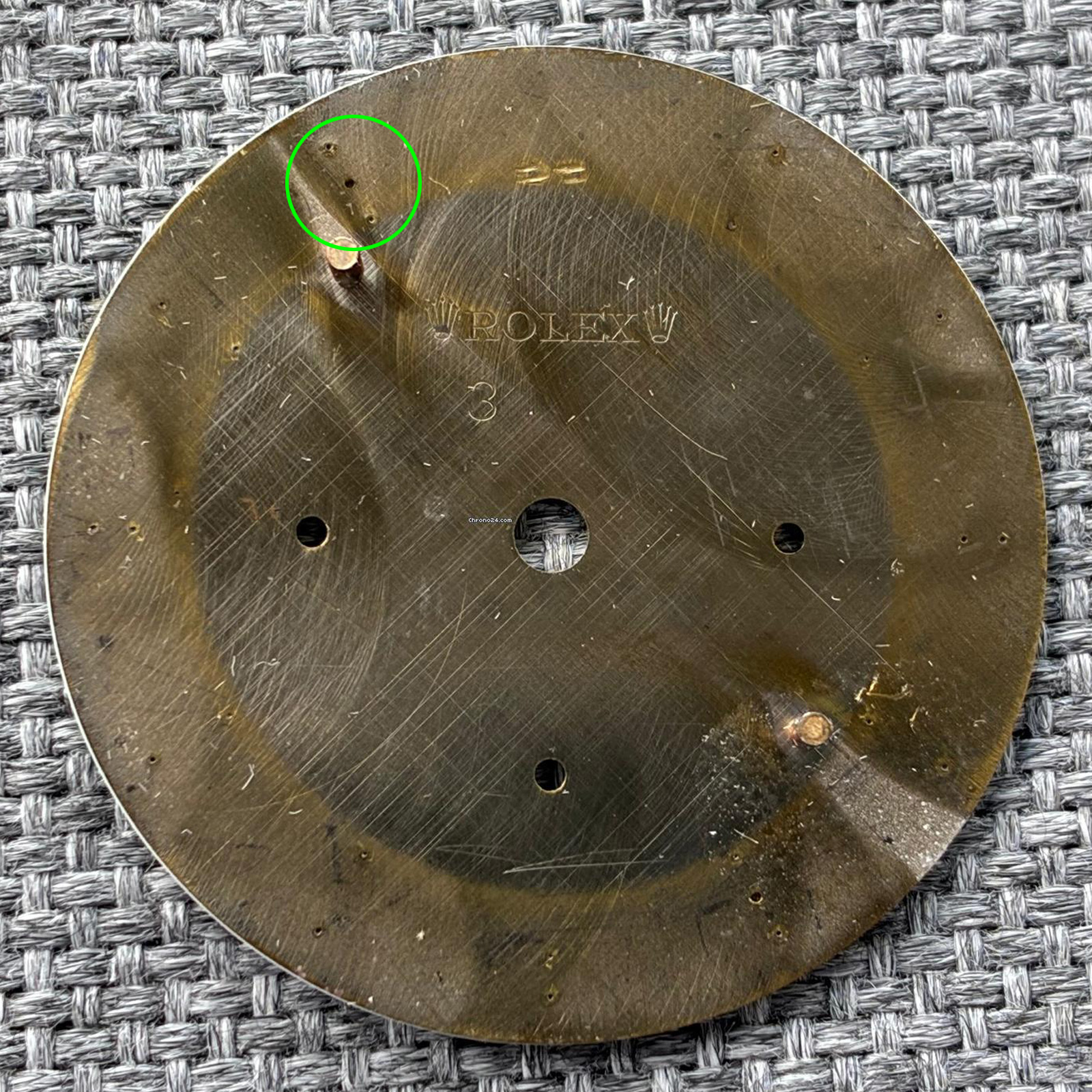 Another important detail to consider on the back of the dial is how the hour markers are attached. The following picture shows that on the present dial, the protruding hour marker pins that go through the dial plate were ground down with a rotary tool, in a rather rough way.