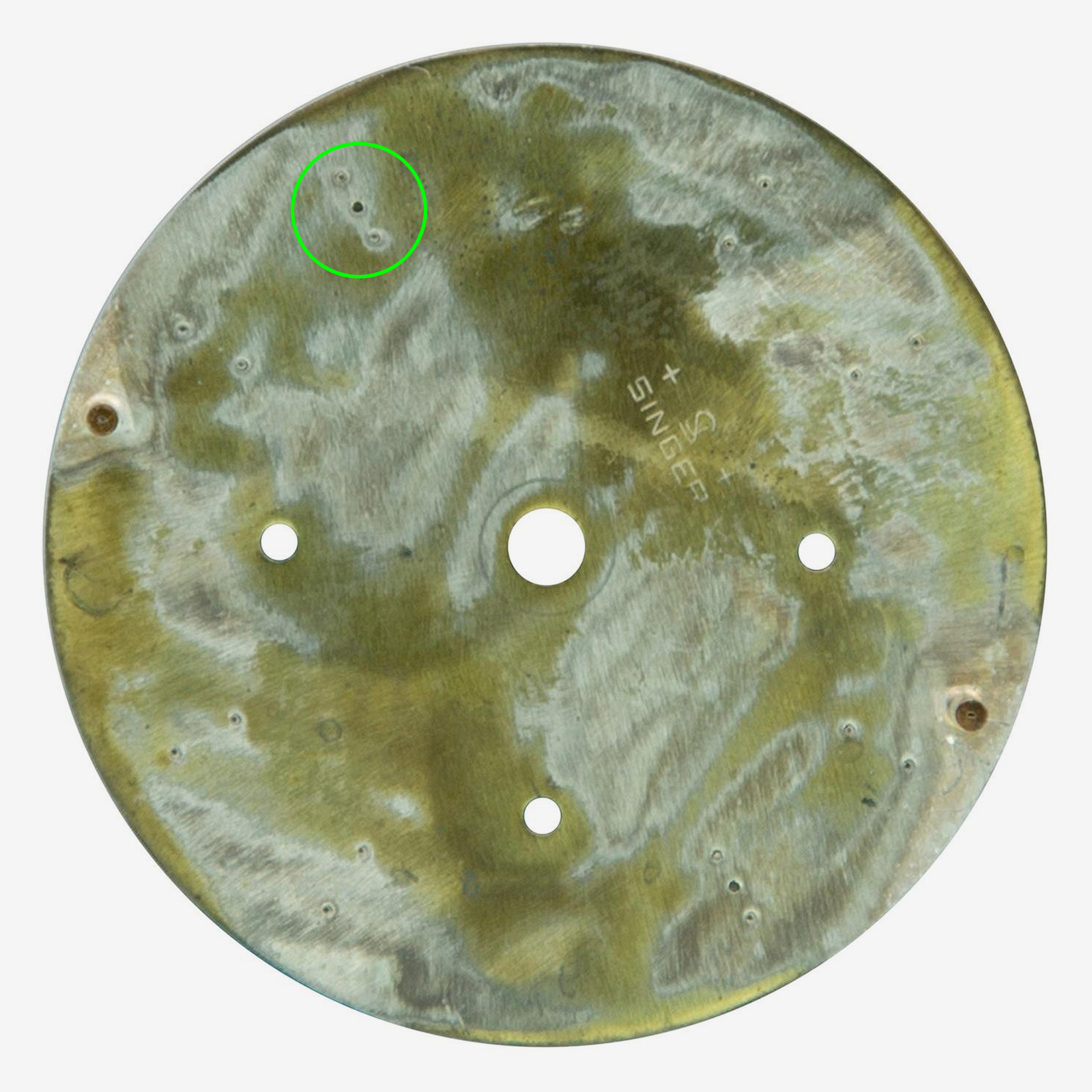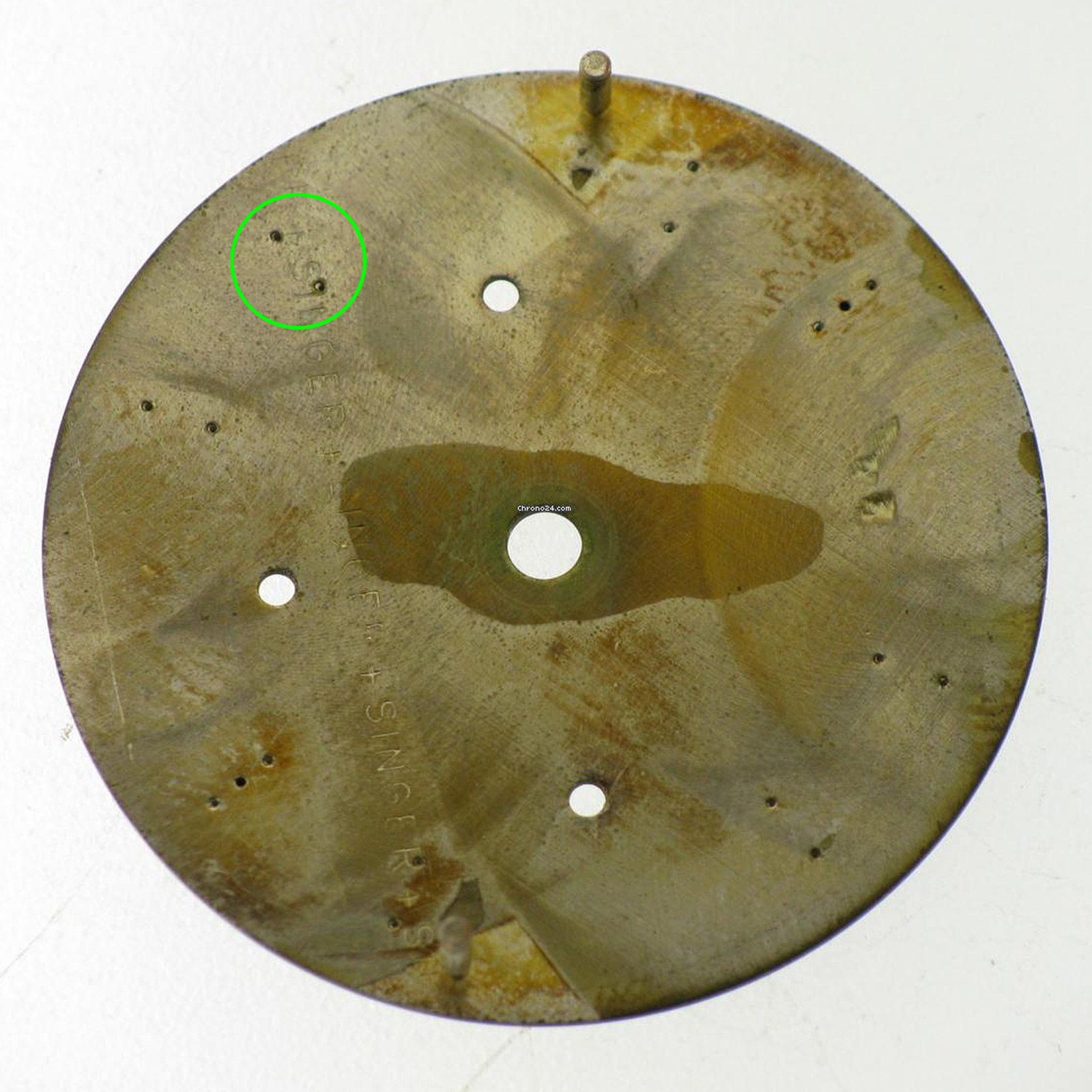 The comparison below shows that, in contrast, on period-correct dials, Singer fixed the pins with great precision and cleanliness.
