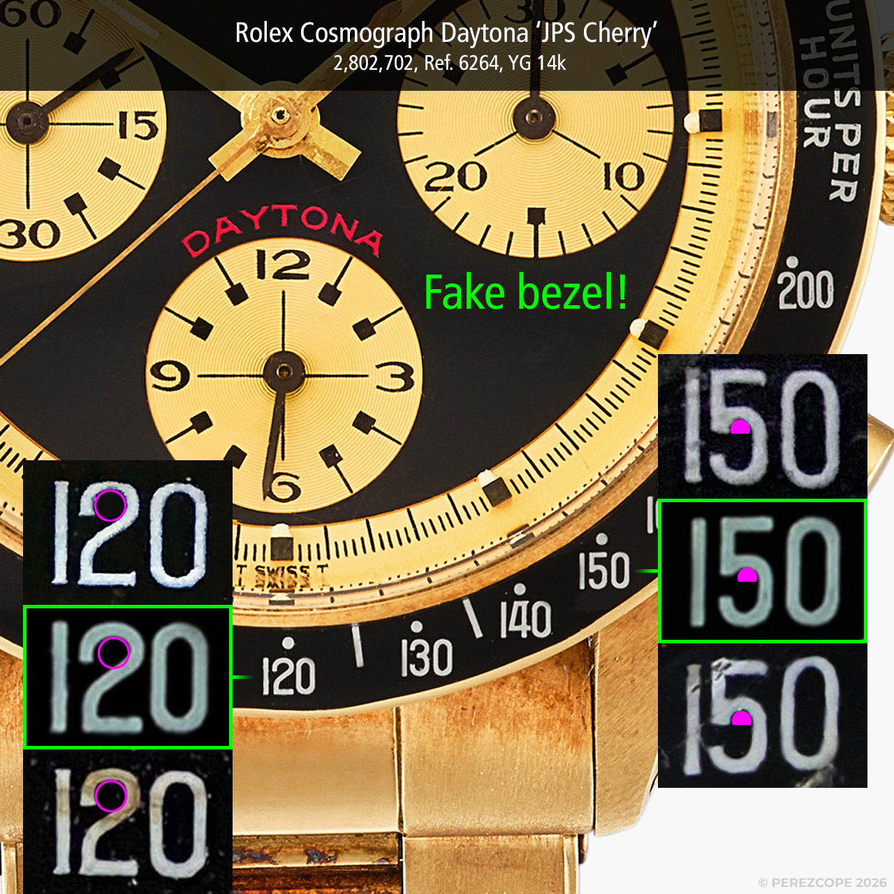 I am not going to point out all the errors to avoid giving counterfeiters too much information, but there is one particular detail that immediately exposes this bezel as a fake. If you know, you know. Having said that, let us now explore the timeline and the interesting details of ‘JPS Cherry’ dials.