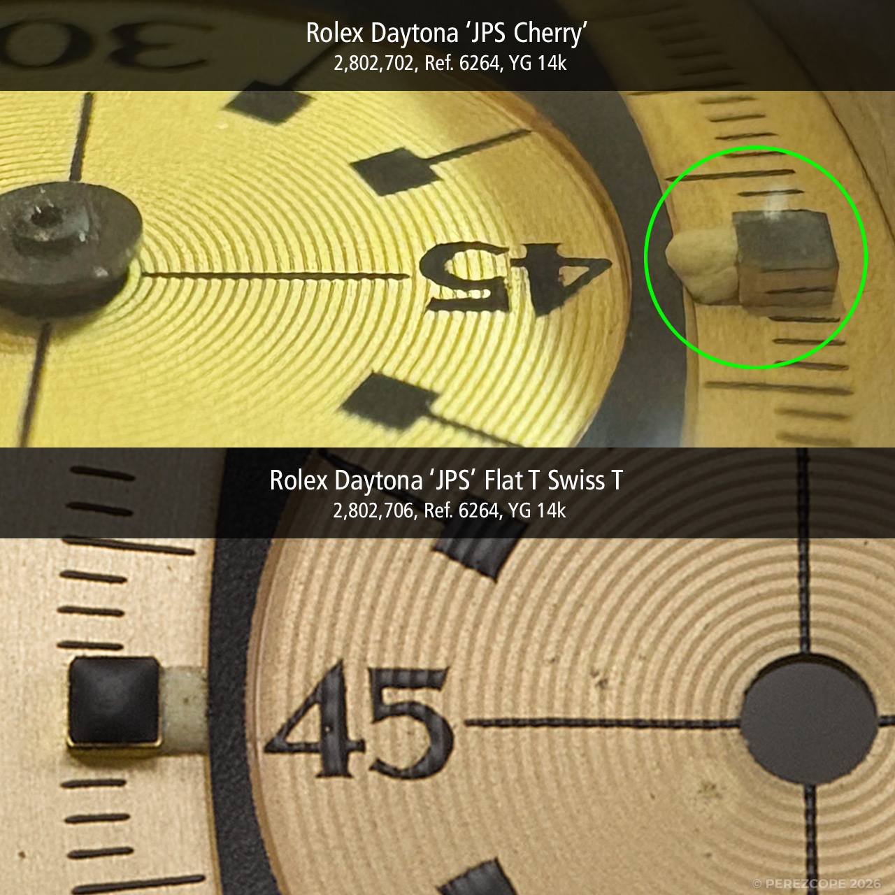 Another interesting observation is that the top of the hour markers on the present ‘JPS Cherry’ is not painted in the same fashion as usual. As the comparison below shows, there is usually a thick black colour blob on the hour markers of these dials. In contrast, on the present watch, the black colour appears very thin and flat.